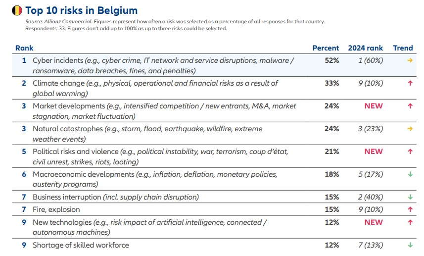 - Changement climatique et catastrophes naturelles : Alors que les catastrophes naturelles figurent parmi les trois principaux risques mondiaux, les entreprises belges sont plus préoccupées par les risques réglementaires et de transition liés au changement climatique que par les événements climatiques catastrophiques eux-mêmes. La hausse des coûts d’assurance et les exigences ESG renforcent la demande pour des solutions de gestion des risques innovantes.