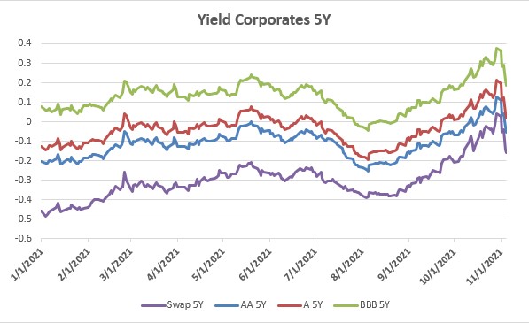 Depuis le début de l’année 2021, les taux 5 ans (swap, corporate AA/A/BBB) ont évolué dans un intervalle étroit. Les spreads de crédit se sont resserrés par rapport au taux swap pour atteindre des niveaux historiquement faibles suite à l’abondance de liquidités sur les marchés et à l’appétit des investisseurs pour les actifs plus risqués dans un contexte de taux bas (les nouvelles émissions arrivant sur le marché primaire étant plusieurs fois sursouscrites).