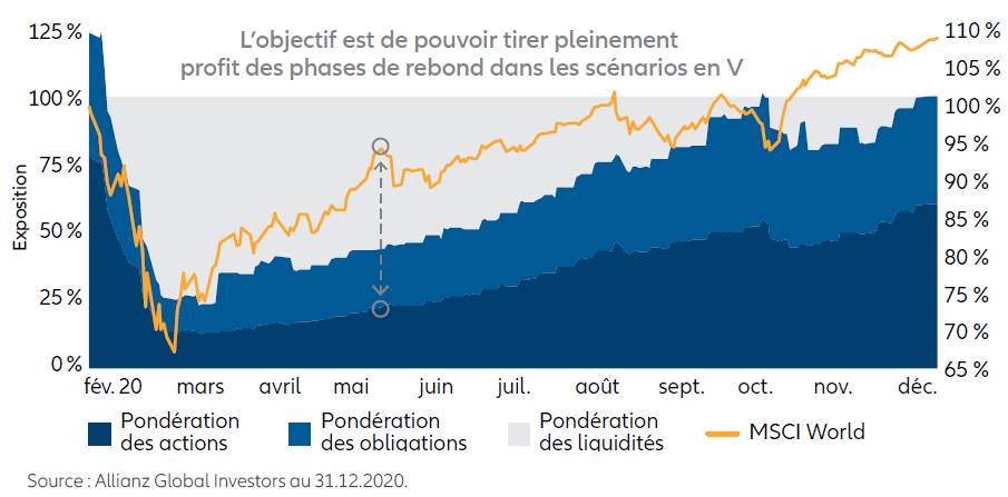 Si l’évolution de l’exposition actions en 2020 par rapport à l’évolution de l’indice mondial des actions a montré une hausse de la pondération actions très en retard sur la reprise des bourses (dans l’exemple, le fonds Strategy Balanced), la pondération du fonds à la fin décembre 2020 était bien de 100% en actions contre un objectif moyen de 50%.