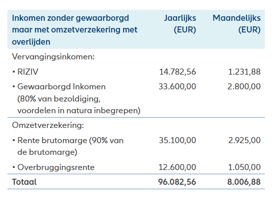 Bij ziekte of ongeval van de zaakvoerder betaalt Allianz het bedrijf een maandelijkse rente om een bepaalde continuïteit van de brutomarge te garanderen en de vaste kosten (tot op zekere hoogte) te dekken. Belangrijk hierbij te vermelden is dat het product 'Omzetverzekering met overlijden' zich richt op vennootschappen met maximaal 1 of 2 bedrijfsleiders, binnen het 'white collar'-segment, die door hun activiteit omzet genereren.