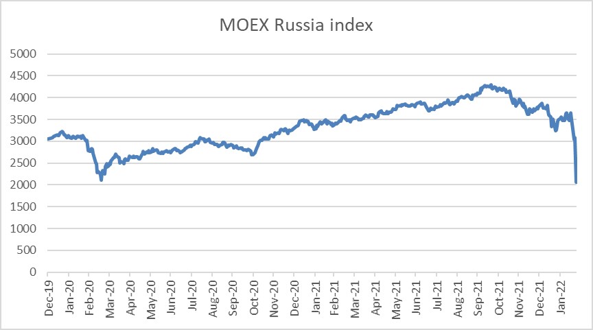 De westerse leiders zullen geen andere keuze hebben dan veel strengere sancties te nemen, hetgeen een terugkeer naar risico-aversie bijzonder sterk versterkt deze ochtend. Om 10 uur 's ochtends was de Euro Stoxx index 3% gedaald, en kwam daarmee zelfs in het gebied van een correctie. De Europese staatsobligatierente was met 7 basispunten gedaald, olie was de grens van $103/vat voor Brent gepasseerd op zijn hoogste niveau in 8 jaar en gas was met 29% gestegen (Rusland levert bijna 40% van het gas dat op het “Oude Continent” wordt verbruikt).