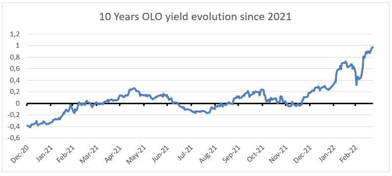 Hieronder ziet u de evolutie van de rente op Belgische overheidsobligaties sinds 2021: -0,40% in december 2020, 0% in december 2021 en 1% in maart 2022.